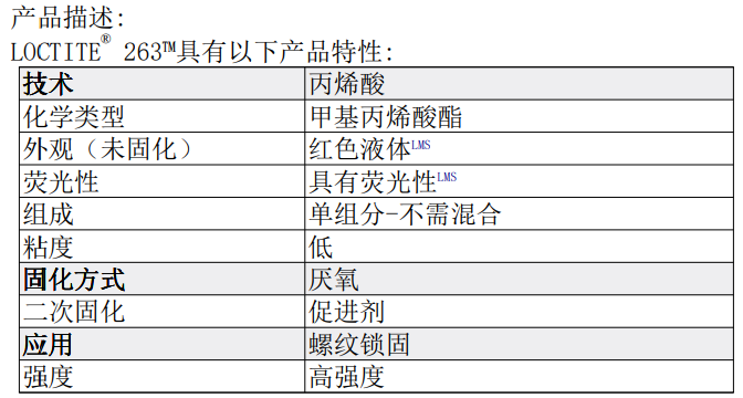 LOCTITE®263? 適合于性鎖固和密封螺紋緊固件該產(chǎn)品在兩個緊密配合的金屬表面間,與空氣隔絕時固化,并且可防止由于受到?jīng)_擊和震動而導(dǎo)致的松動和泄露。LOCTITE®263? 特別適合重載應(yīng)用,如發(fā)動機箱螺栓、泵殼螺栓以及其他大強度緊固件裝配LOCTITE®263? 固化性能很好,不僅在作用于活性金屬(諸如黃銅、紫銅),同時作用于惰性基材,諸如不銹鋼和鍍層表面此產(chǎn)品耐高溫抗油脂。它能容許各種輕微表面污染,諸如切割、潤滑、防腐蝕和保護液體內(nèi)所含的油污